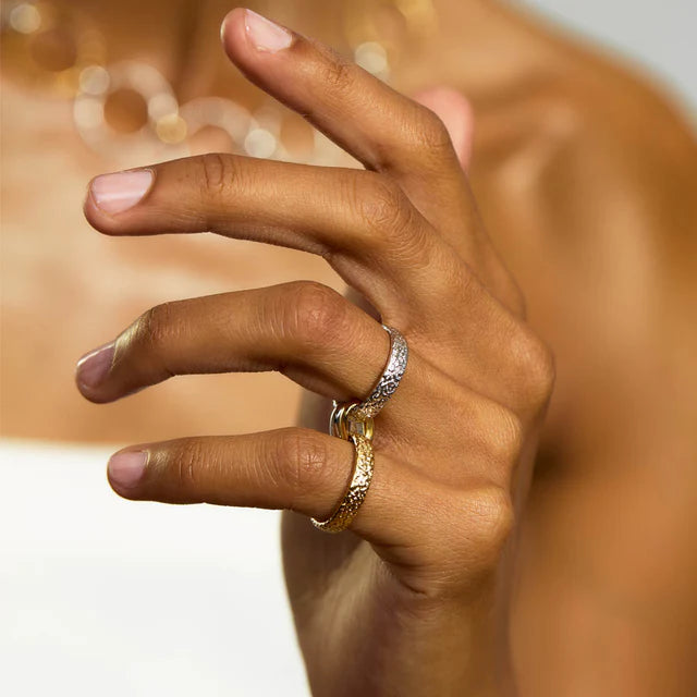 The Multi Finish Double Hula Joined Ring features a stylish and innovative design, allowing you to wear it as a bold double ring on one finger or split across two fingers for a unique look. Combining sterling silver with gold vermeil accents, this piece brings sophistication and versatility to any jewellery collection.