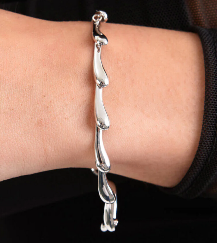 This stunning Continual Drop Bracelet is crafted from 925 sterling silver, featuring solid droplet shapes linked together for a seamless and timeless design. Hand-finished with a rhodium overlay for added shine and durability, this bracelet is a must-have for any jewellery collection.
