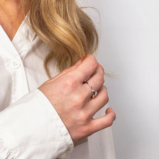The Single Drop Ring from Lucy Quartermaine’s iconic Drop Collection is a sleek and versatile design. This tear-shaped sterling silver ring is lightweight and can be easily adjusted for a perfect fit. Handcrafted with a rhodium overlay, it offers long-lasting shine and durability.