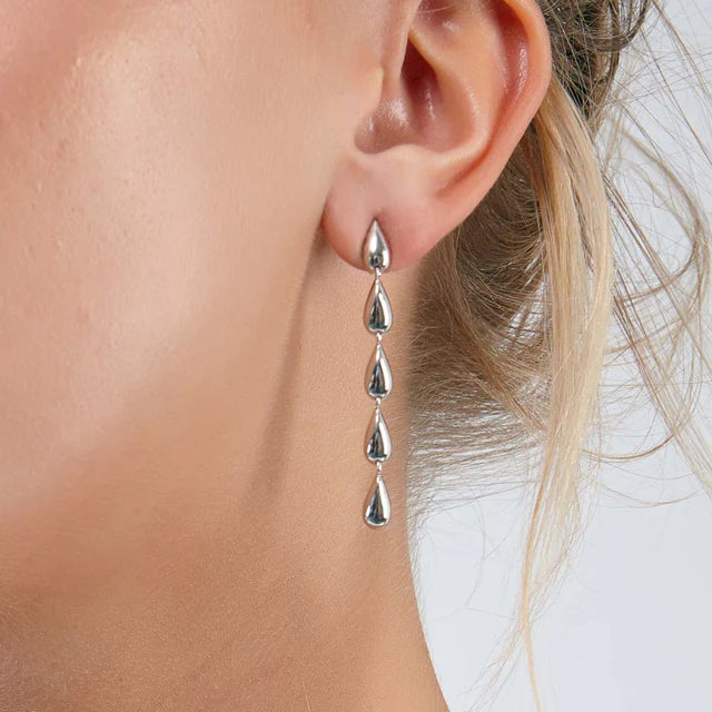 These stunning earrings feature five lustrous teardrop-shaped droplets, suspended gracefully to create a beautiful cascade effect. Inspired by falling tear drops, these earrings bring an elegant and emotional touch to any ensemble.