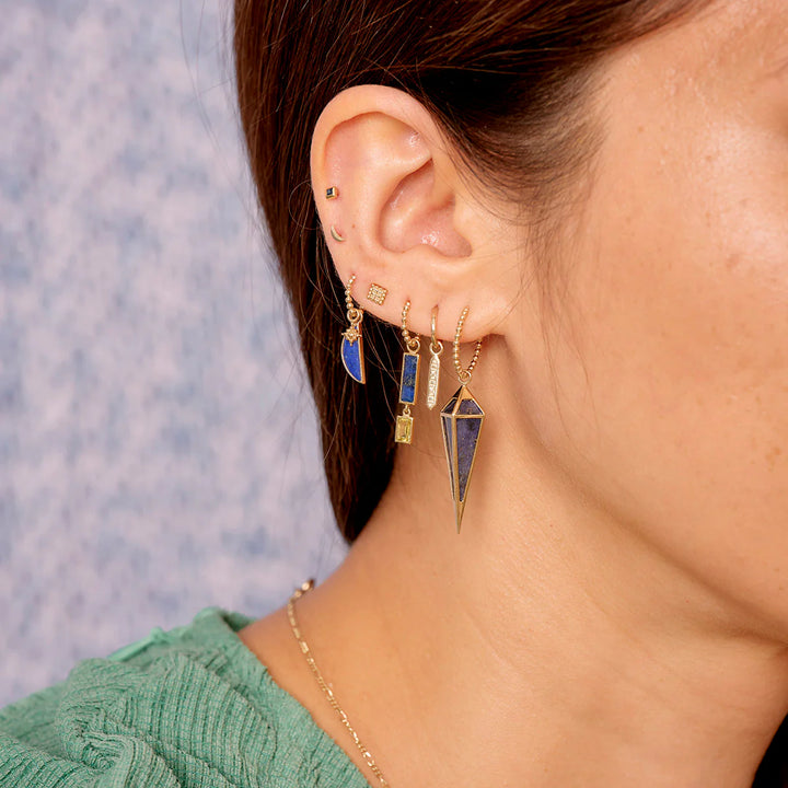 Explore the Long Point Pendulum Plaques, blending hand-cut gemstones with a solid gold frame in an edgy and contemporary design. Attach these plaques to our clicker hoops, chains or bracelets.