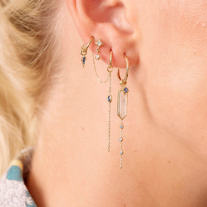 Introducing the Mini Point Rhombus Gemstone Plaque, featuring an elongated rhombus shape set with Blue Sapphires. Can easily fit onto hoop earrings, chains or bracelets.