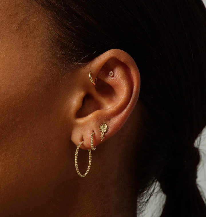 The Beaded Clicker Hoop is a great way to add texture to your ear story. This hoop is available in two sizes, original and large, and is made of solid 9ct yellow or white gold. These hoops are part of our Core collection. Wear this hoop plain, or create your own ear story by choosing from any of our plaques.