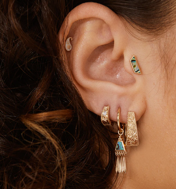 The Tesserae Pearl Tassel Plaque .5 is part of our First Love collection, which is inspired by the first pair of earrings purchased on a holiday. Featuring white Pearl inlay, or iridescent green Abalone Pearl. It has us all reminiscing about teen romance and holidays!