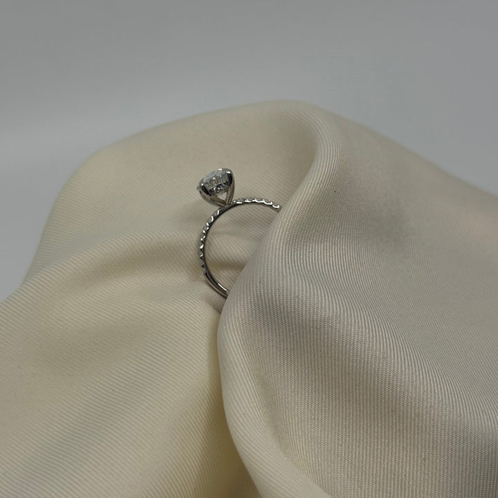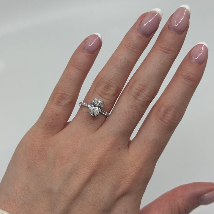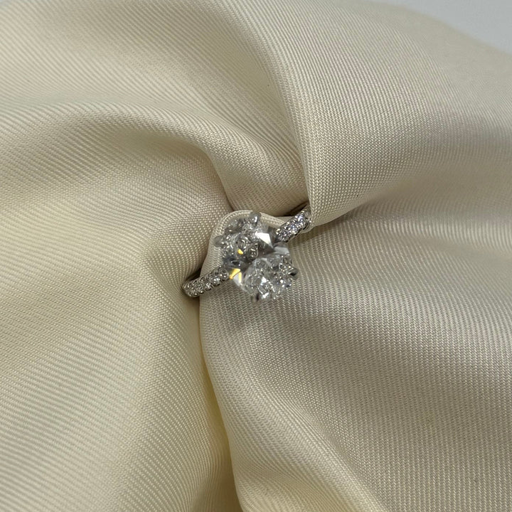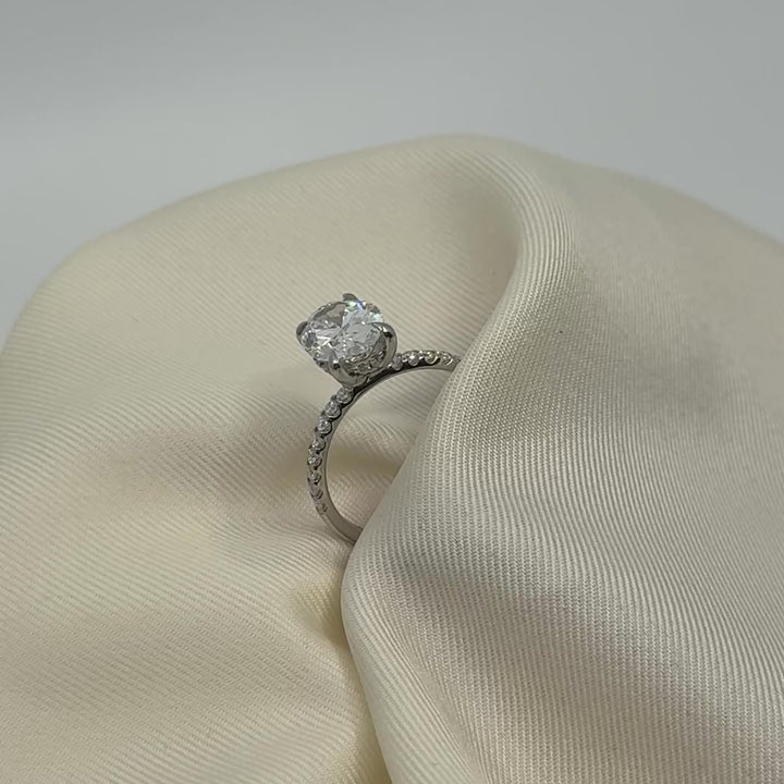 Our platinum LAB diamond solitaire ring features an impressive 2.00ct certified oval diamond held in 4 talon claws with a hidden halo of glistening diamonds on the under bezel and elegant diamond set shoulders.