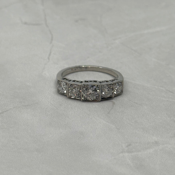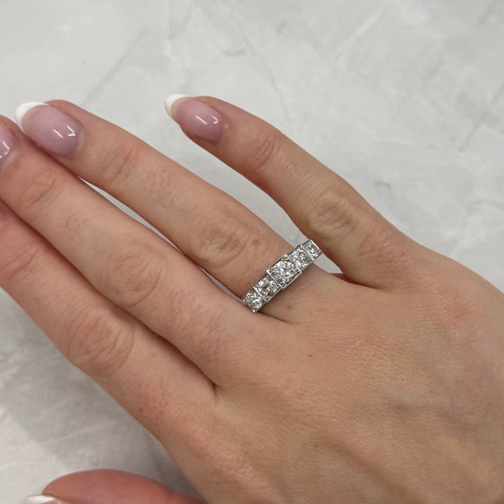 From our pre-owned vintage collection, this classic 5 diamond ring displays approximately 1.50ct of dazzling diamonds. The delicate millgrain edging framing the diamonds gives this ring the perfect vintage feel along with stacks of romance and charm. Lovingly refurbished in our workshop.