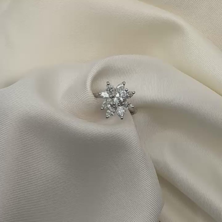 From our pre-owned vintage collection, this platinum ring features a floral design with a cluster of marquise-cut diamonds. Approximate diamond weight is 1.20ct total.