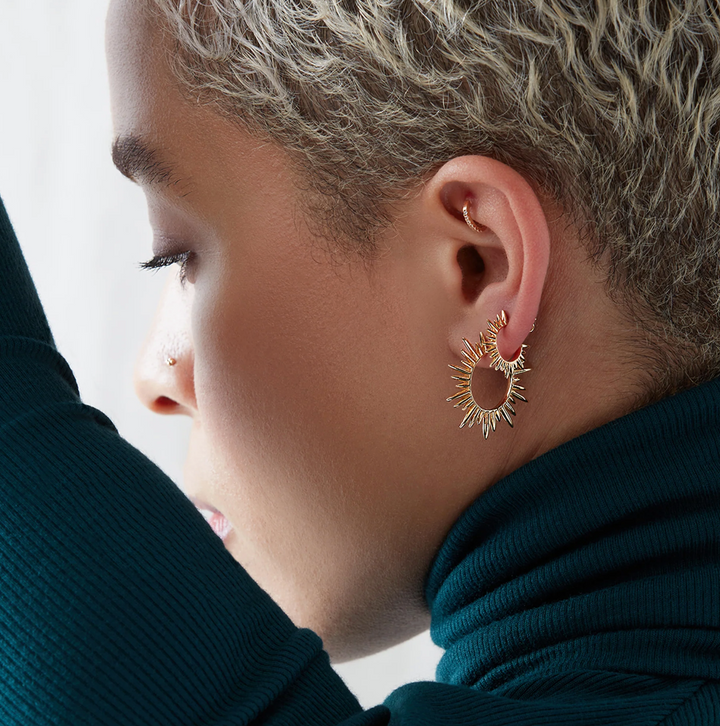 Drop it Like it’s Hot. Radiate electric goddess vibes in these iconic Art Deco sun hoop earrings, designed to wear everyday and from desk to dinner. Elegant, simple and secure butterfly backs make for easy on and off.