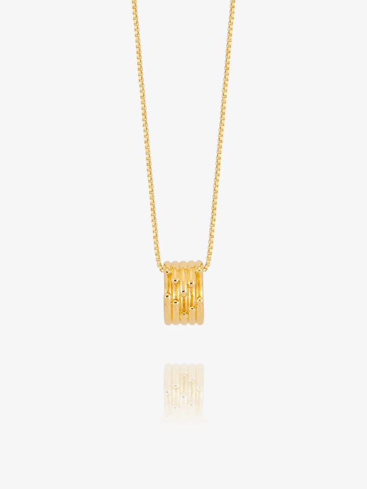 Crafted to honour the journey. The Lifestream Ring Necklace is part of the She collection - A sculputral exploration of timeless wardrobe staples with a design twist. Hand-crafted from 18ct gold-plated recycled silver, this unique, open circle pendant is inspired by French sculptor Bernar Venet and it features Art-Deco strands that represent the many facets of womanhood. Finished with an adjustable-length chain for versatile wear.
