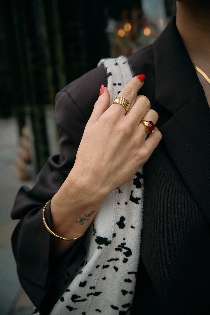 Crafted to honour the female journey. The Lifestream Statement Ring is part of the She collection - a sculptural exploration of timeless wardrobe staples with a contemporary design twist. Hand-crafted from 18ct gold-plated recycled silver, this luxuriously contoured ring is inspired by French sculptor Bernar Venet and features smooth, Art Deco-inspired strands that represent the many beautiful facets of womanhood. It is adjustable in size for multiple ways to style.