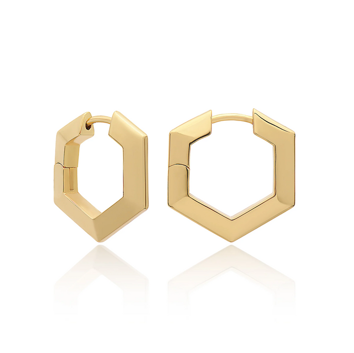 Feel iconic. Hexagon hoop earrings reimagined in a chunky bevelled silhouette for day to night chic. A simple and secure click mechanism for easy on and off.