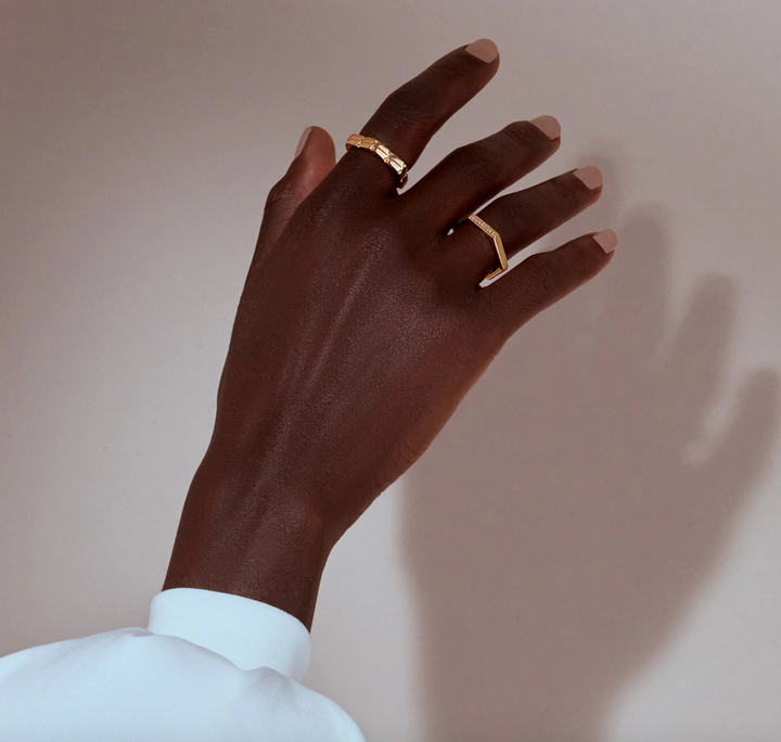 Feel Iconic with our signature Hexagon stacking ring adorned with flashes of white topaz. Designed to stack high for seriously luxe layering. Encapsulating the iconic duality of padlocks and keys to inspire you to awaken your potential, express your true self and live fearlessly.
