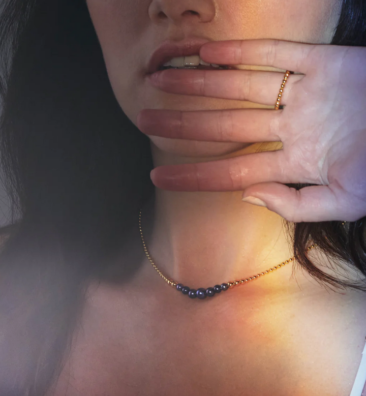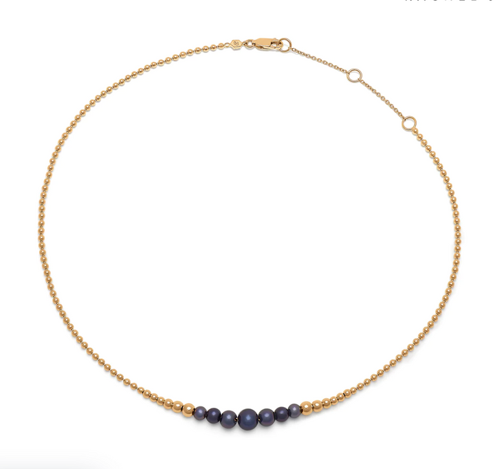 Dark and mysterious. Join us on an intergalactic journey into the black-purple tones of the cosmos with this graduated gunmetal black pearl necklace with futuristic gold orbs. A contemporary twist on the classic pearl necklace designed for the modern, fearless woman of the future.