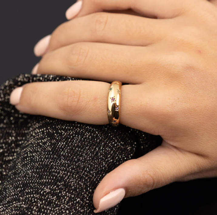 This Celestial Dome Ring with Rainbow Stones is your passport to the stars! Offering a silky-smooth finish and a dazzling shine, let this dome ring be a memento of the beauty of the universe.