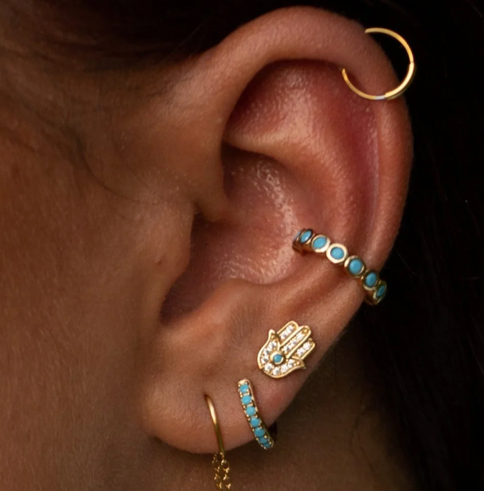 These gold Fatima stud earrings with turquoise stones are perfect for the summer festival season, or for those that love peace and tranquillity!