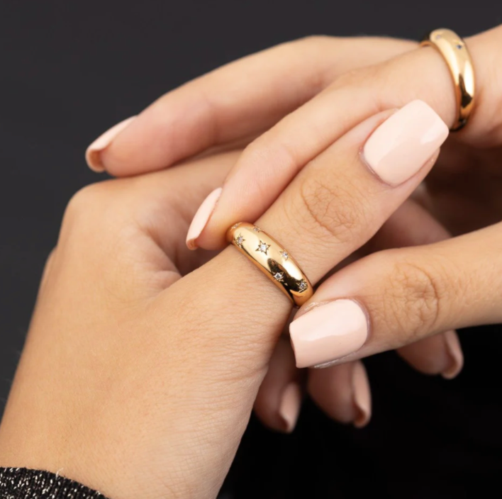 This celestial dome ring features a silky texture, glossy lustre and stunning curvature. Studded with clear cubic zirconia stones to give this timeless statement ring subtle sparkle!