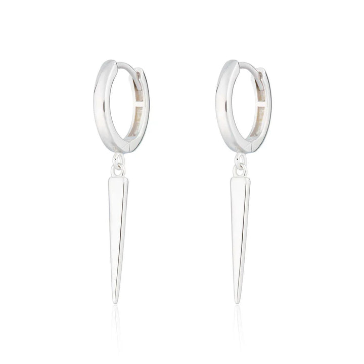 A contemporary design it combines smooth sleek surfaces with a rounded spike and makes the perfect on-trend addition to our hoop earring range. Available in rhodium or gold plated silver these drop hoop earrings feature a spiked charm suspended from a polished hoop allowing for subtle movement and giving off a dazzling shine when it catches the light.
