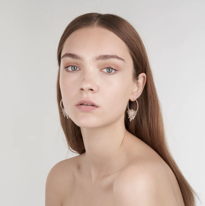 Quill Hoop Earrings are handcrafted from sterling silver. An articulated shape, Quill’s curves capture the light, drawing attention to the ears. Designed with a left and right side and secured at the back with a butterfly. Quill Hoop Earrings are a contemporary twist on classic hooped styles, with the quills taking centre stage.
