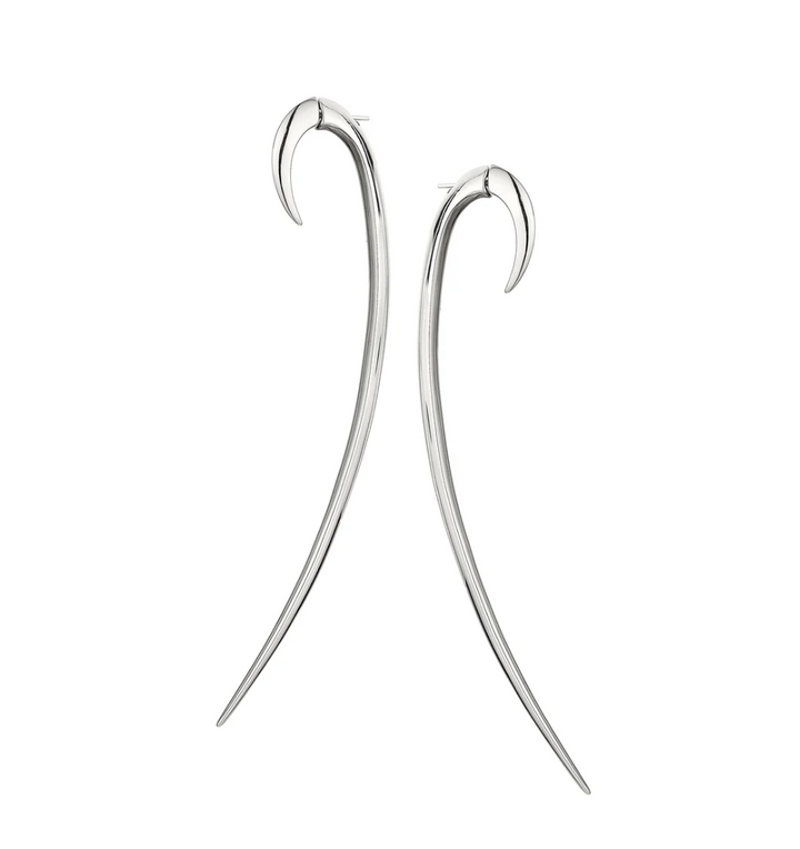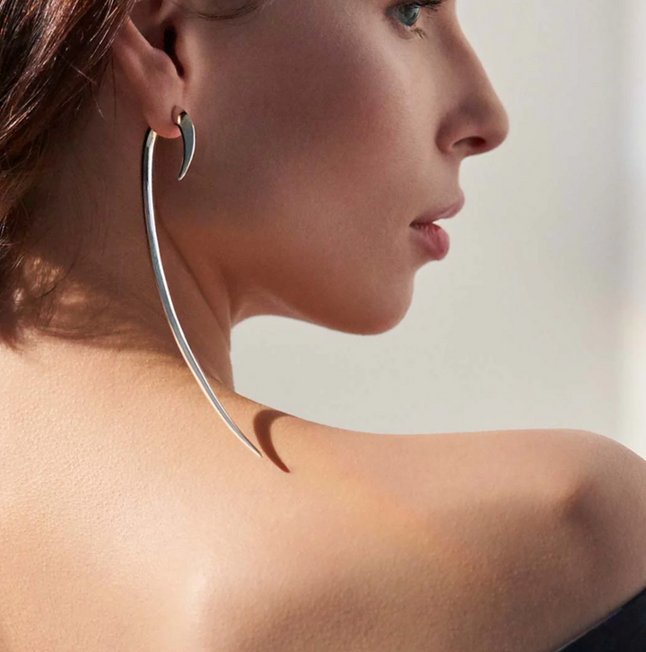 Hook Size 4 Earrings are handcrafted from sterling silver, with a magnificent drop of 120mm. Hook’s innovative design is a two-piece construction, seamlessly fitting together front to back, creating a graduated shape around the ear, securely fastened in place. In an unprecedented Size 4, our signature Hook Earring is magnified; voluminous curves sweep down and inwards, ravishing the neck, grazing the collarbone. Commanding attention, Hook Size 4 Earrings are fierce jewels with stature, weight and presence. Designed with a knife-edge, sharpening the silhouette, creating light refracting facets on the jewels surface.