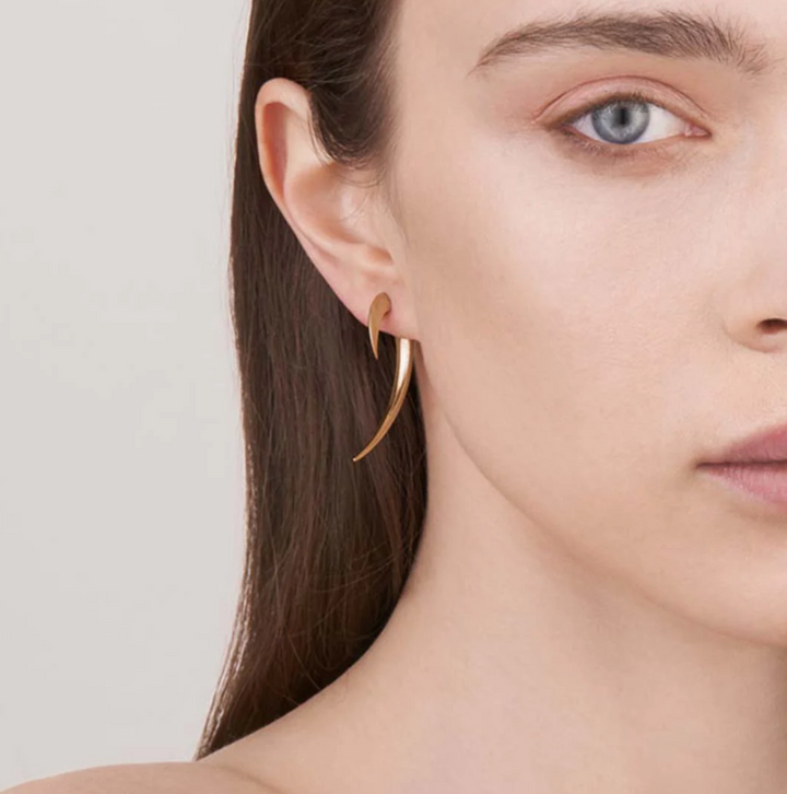 Our yellow gold vermeil hook earrings are pure and seductive. A distinct silhouette, these cool yellow gold earrings make a fierce and daring addition to our yellow gold designer jewellery collections. A versatile everyday piece, the long yellow gold statement earrings come as a two piece construction that seamlessly fit together at the back and front creating a formidable silhouette around the ear. Available as pairs and as single earrings!