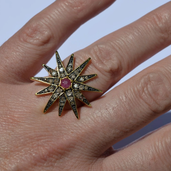 The Starburst, inspired by Victorian brooches, is set with natural diamonds and a ruby centre. 27 diamonds are surrounded by dark rhodium plating to enhance the vintage look and your choice of centre stone is complimented with gold.