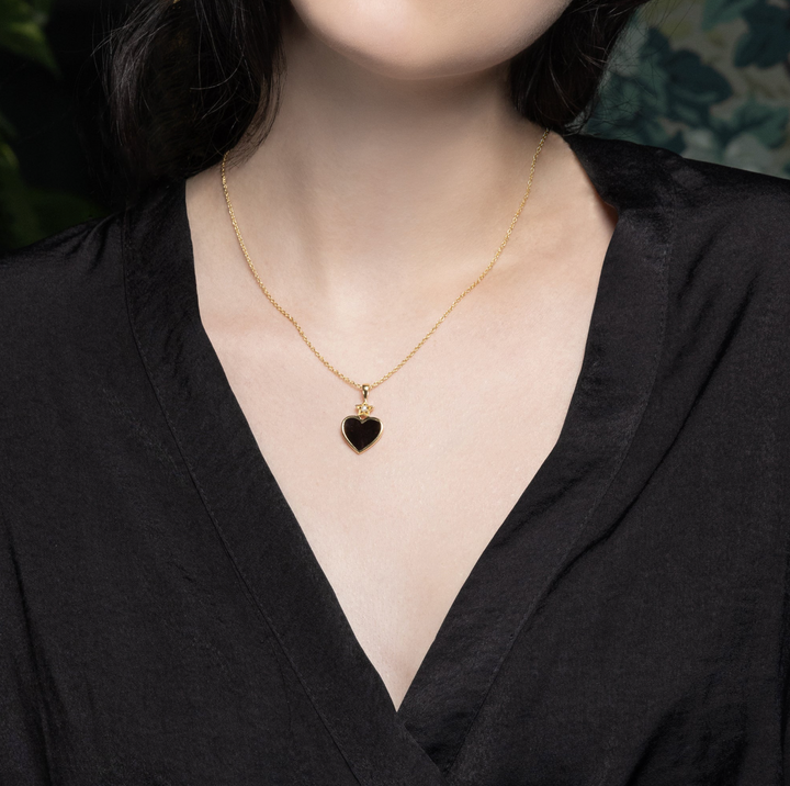 The Amy Pendant now in Black Enamel. Inspired by the shining star of Amy Winehouse, the Amy Pendant has a special mix black semi transparent enamel over a starburst engraved heart, topped with a pearl set 5 pointed star. The pendant comes on a delicate yet strong belcher link chain with length adjustments to wear with different necklines.