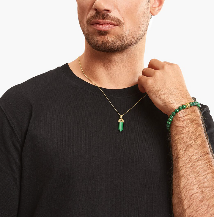 Thanks to its unique, delicate pattern, the green malachite is a special stone. Even among the old Egyptians, this healing stone was said to have a positive effect on the psyche and outlook on life. This bracelet consists of beads that perfectly resemble said stone. Choose this bracelet as your new companion to benefit from the positive energy it spreads. This stone bracelet is combined with a bead that is engraved with fine, mystical lines and set with black zirconia stones. The bead as well as the logo ring are made of recycled silver with 18k gold plating.