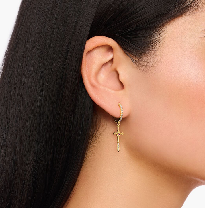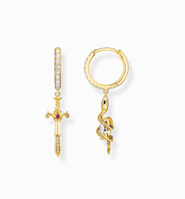 Wear these extraordinary hoop earrings with pendants featuring a mismatch design as a reflection of your own, personal story. They are made of recycled silver with high-quality 18k gold plating and small, white zirconia stones. One pendant comes in the shape of a sword and is adorned with fine patterns as well as a red Lab Grown sapphire. The second pendant is a three-dimensional snake that writhes around a white zirconia stone with a drop cut. Engraved lines imitate its scales, black cold enamel its expressive eyes.