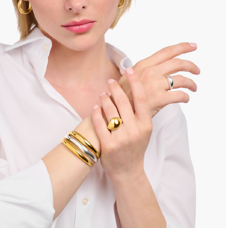 An elegant accessory that exudes delicate luxury: this gold-coloured bangle is elaborately designed with timeless refinement and inspired by organic shapes. It is created thanks to finest craftsmanship, it emulates classic silhouettes and exudes effortless elegance. Enjoy the feeling of wearing this bangle made of recycled silver with 18k gold plating. It complements each and every outfit and is very light, since its inside features an open design.