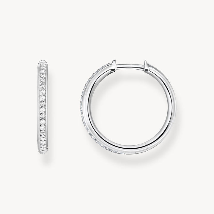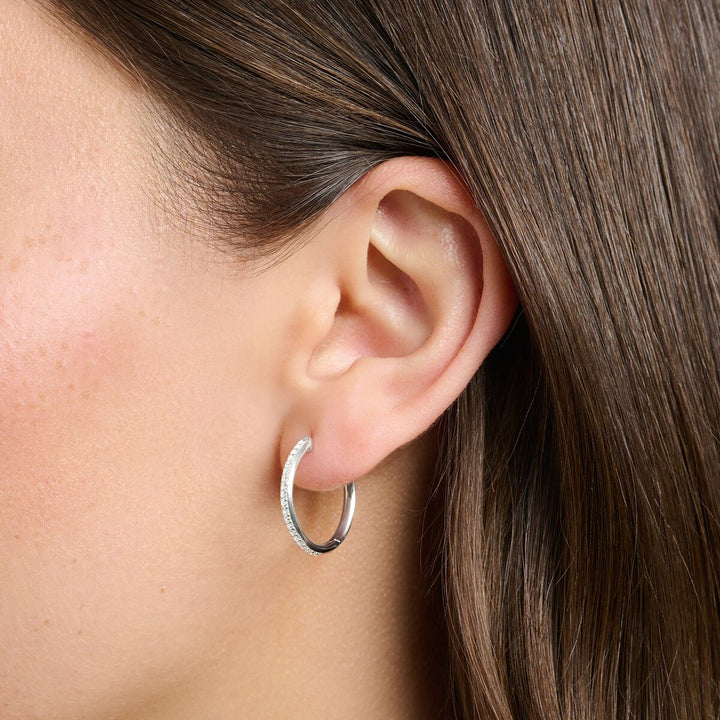 Timeless Must-Have-Earrings: High-quality hoop earrings made from 925 Sterling silver with stone embellishment. Their simple design transforms them to real classical pieces of jewellery that should not be missing from your own collection. The highlight are the 40 white round-shaped zirconia stones at the front of the hoop earrings. They are hand-placed in open prong settings which intensifies the sparkling colours of the stones: Each light beam can pass through the stones. The hoop earrings can be worn solo or combined with other pieces like earrings, necklaces, bracelets or rings to set a sparkling highlight to your look.