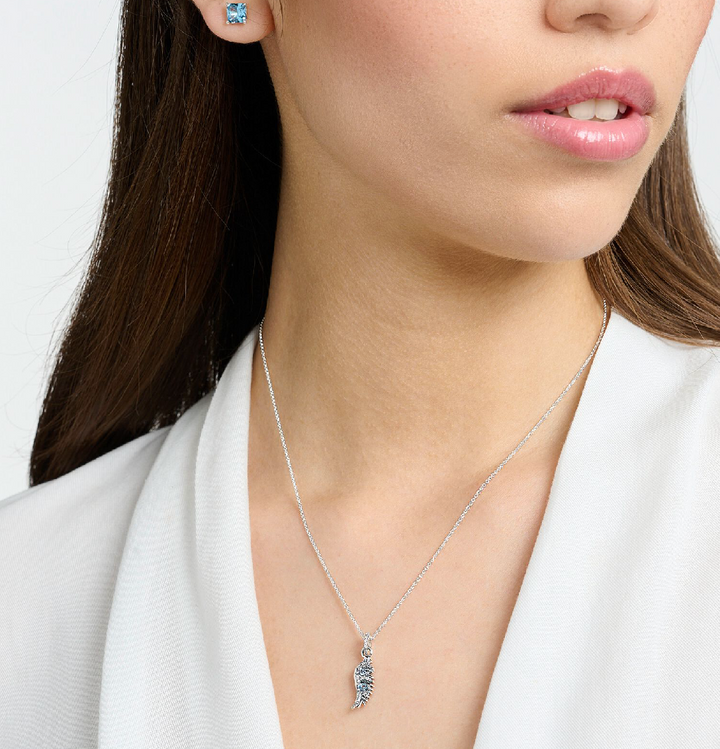 Mythic symbolism: The women’s necklace with a small pendant is elaborately crafted of slightly blackened 925 Sterling silver. The striking eyecatcher is the stylised wing of the mythical phoenix bird. Its feathers are fashioned on two levels and set by hand with 35 stones in white and aquamarine blue.