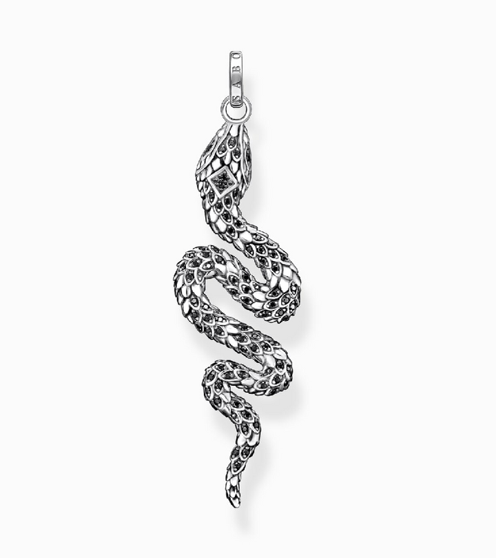 Mystical snake: this large pendant is elaborately crafted from 925 Sterling silver. Its highlight is a winding snake whose scales are blackened for a vivid design. Black cubic zirconia stones accentuate the eyes and the scales lending the silver pendant a noble radiance. A THOMAS SABO engraving adorns the eyelet of this piece of jewellery. It can be worn as desired on a necklace from the THOMAS SABO collection.