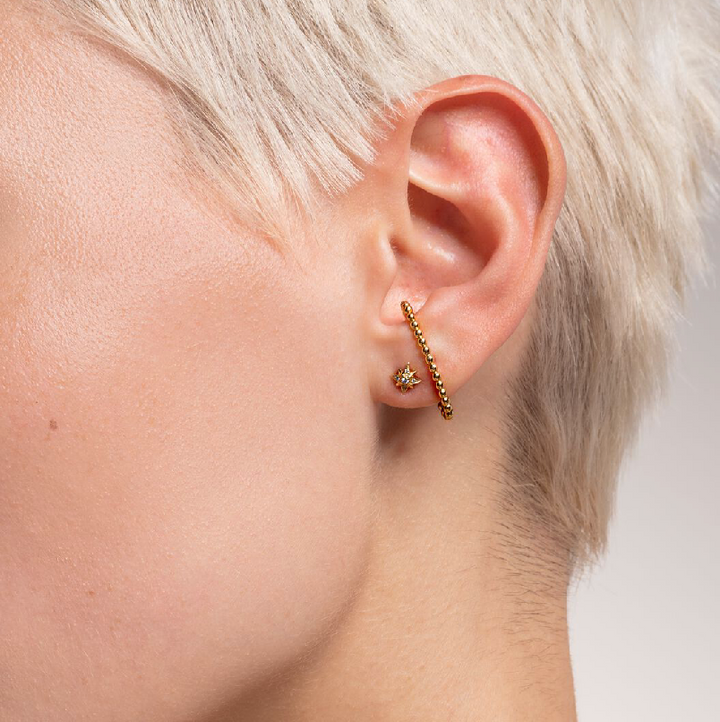 Discover the cosmos with this sparkling single ear stud in dazzling star design. Finished in yellow-gold plating, the earring combines elegance with lightness. The white zirconia stars are hand-set into their places at the little star. Combine it with other pieces from the Charming Collection and add sparkle to your life!