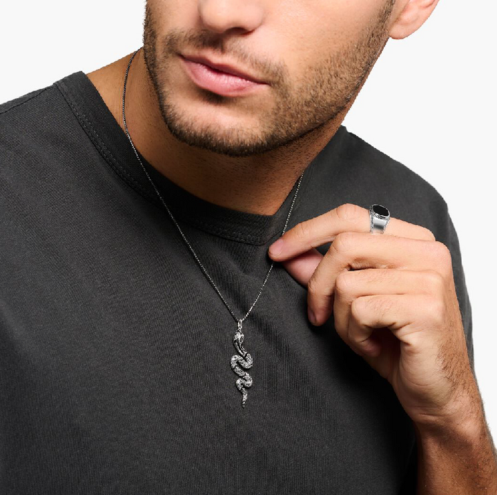 Rebellious interpretation of the symbol of section: A detailed and handmade snake is the centrepiece of this jewellery-set consisting of a length adjustable necklace and a pendant for men. Fine engraving lines, dot-structures and black cold enamel are decorating the pendant. Add this pendant necklace for men as high-quality accessory to your expressive style!
