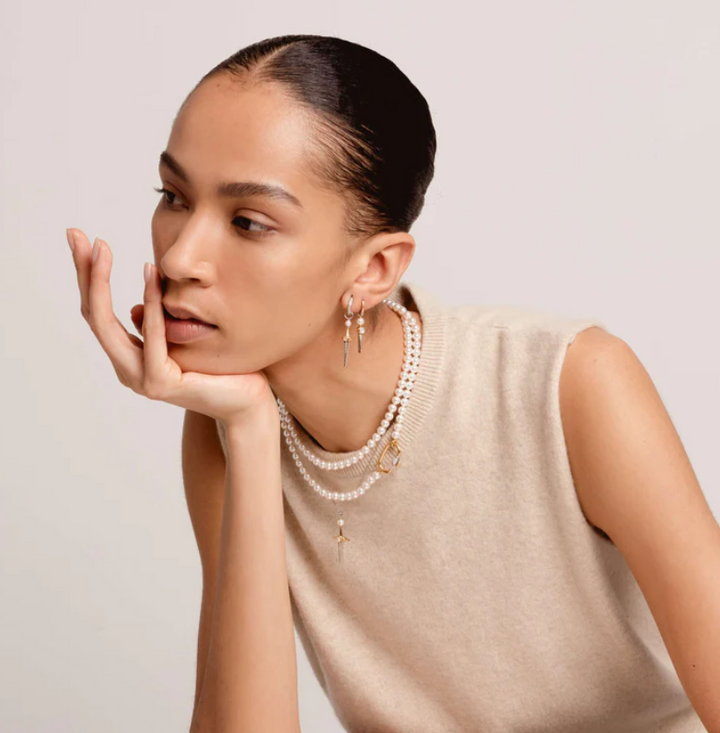 These TI SENTO gold-plated ear charms feature an elongated star shape adorned with lustrous pearls, dreamy mother of pearl, dazzling pavé, and radiant yellow gold plating. The elongated star design gracefully dangles from your ears, adding a touch of celestial charm to any ensemble. Pearls are juxtaposed with sharp shapes creating a perfect balance between light and darkness. Elevate your style and embrace the magic of celestial elegance with these captivating treasures.