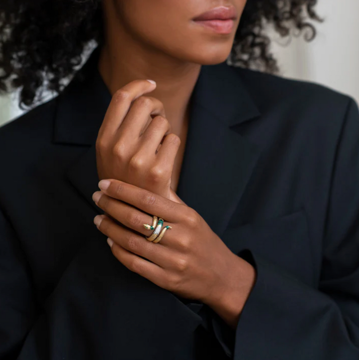 This gold-plated TI SENTO silver snake ring is handset with emerald green stones and white zirconia. It has eyes of emerald too! An opulent and iconic showpiece.