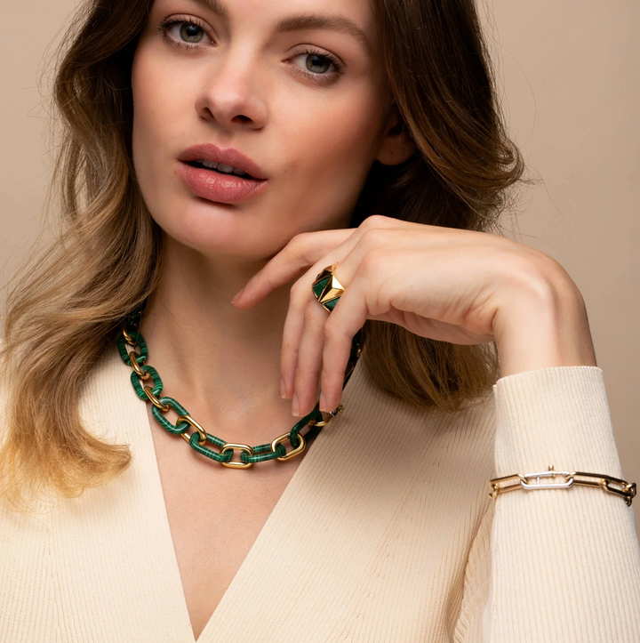 This TI SENTO – Milano gold-plated silver ring features a refined stud structure with handset malachite green stones. Dark and light malachite green tones blend together bringing a sense of balance. This statement ring will bring a touch of luxurious sophistication to any outfit!