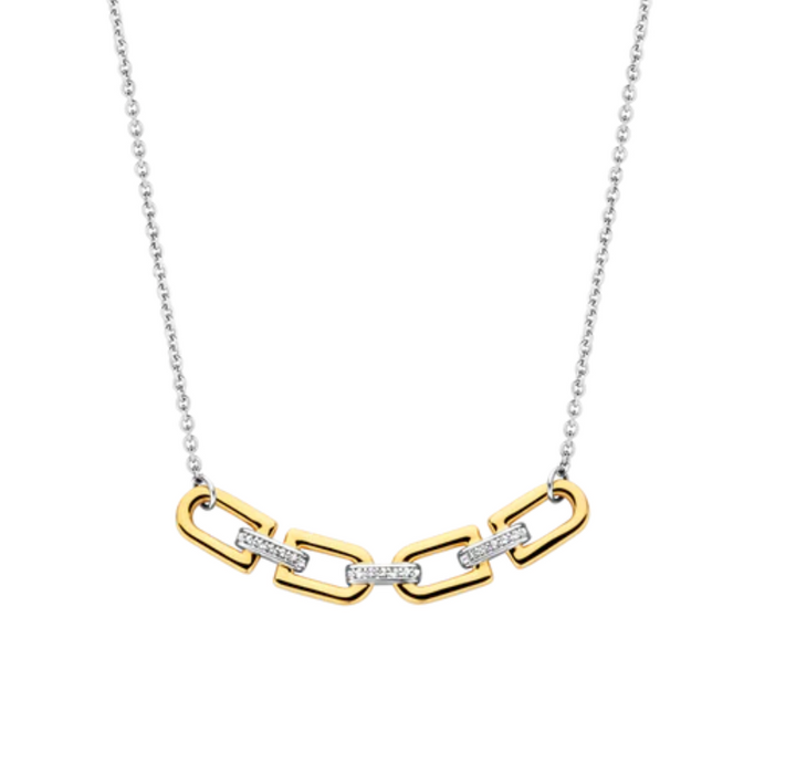 This TI SENTO gold-plated link necklace showcase a modern classic design that seamlessly merges sophistication with a touch of edgy allure. Crafted from premium 925 sterling silver, this necklace features our signature gold-plated links held together by luminous pave links that add a touch of luxury to this piece. With its versatile elegance, this necklace effortlessly transitions from casual to formal settings.