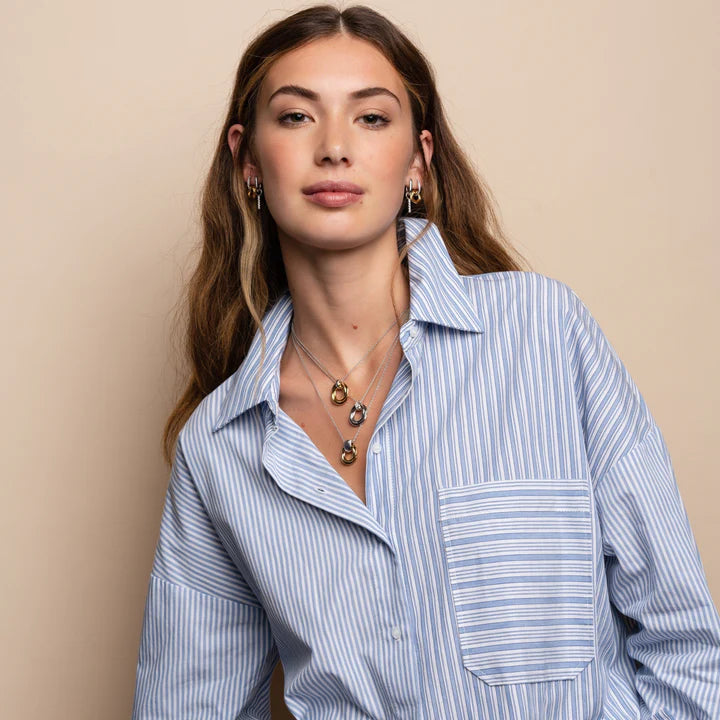 This gold-plated silver necklace flaunts a circle pendant with elegant twisted lines and a pavé of white cubic zirconia at its centre. This gold-plated necklace, made of 925 sterling silver, is a luxurious statement piece. A layer of platinum protects the jewel and keeps it luminous. Layer it with other necklaces to lighten up your décolleté. The length of this necklace is adjustable, its range is 38-48cm.