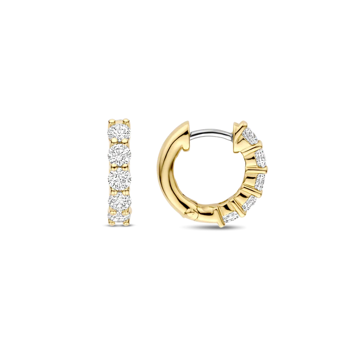 Crafted from 925 sterling silver and finished with a high-shine yellow gold plating, every surface gleams with cool brilliance. A line of handset white cubic zirconia traces the front curve, catching the light at every turn. The streamlined, hinged-huggie profile makes them an effortless day-to-night staple — wear them solo for refined polish or stack them for contemporary intrigue.