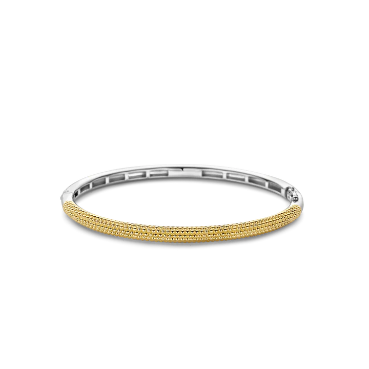 This gold-plated silver bangle bracelet features a gold-plated structured design. The bracelet is crafted from 925 sterling silver and plated with gold. This sophisticated and timeless classic will bring an air of rediscovered vintage to any outfit.