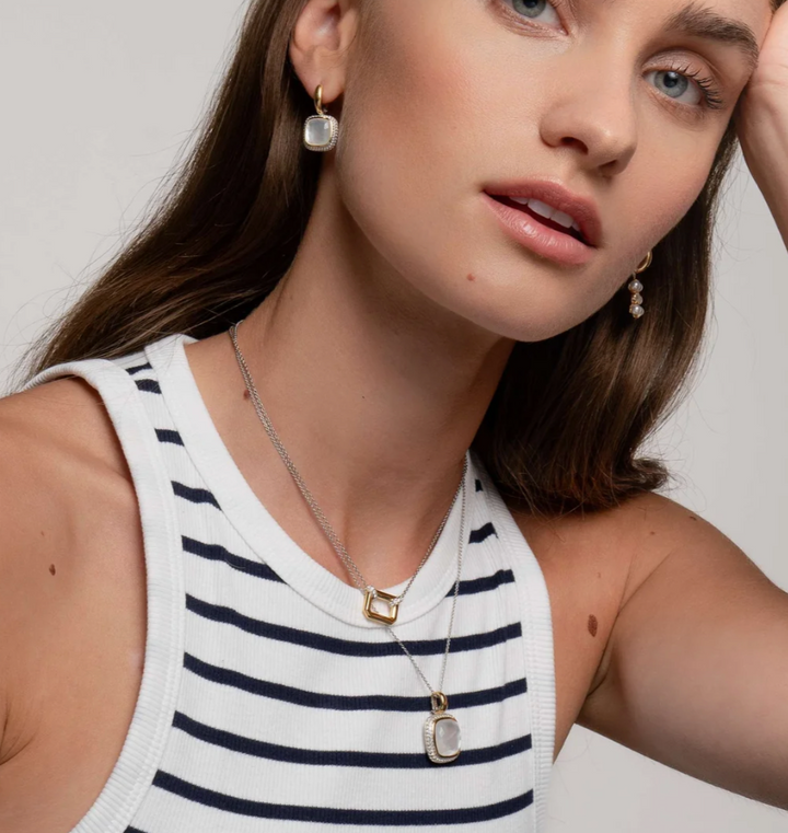 This TI SENTO gold-plated pendant displays a large mother of pearl cushion shape stone handset in a yellow gold-plated setting adorned with dazzling pave. A harmonious blend of sleek geometry and luxurious timelessness. The funky cushion shape, symbolising stability and direction, showcases TI SENTO’s iconic design elements. Crafted from premium 925 sterling silver, the pendant is plated with yellow gold to add vibrancy and radiance to the design. Add a touch of luxury to your neckline, this pendant can be clipped to any necklace thanks to its refined clip ring – let this eye-catcher be a conversation starter! The pendant comes with a dainty silver chain necklace.