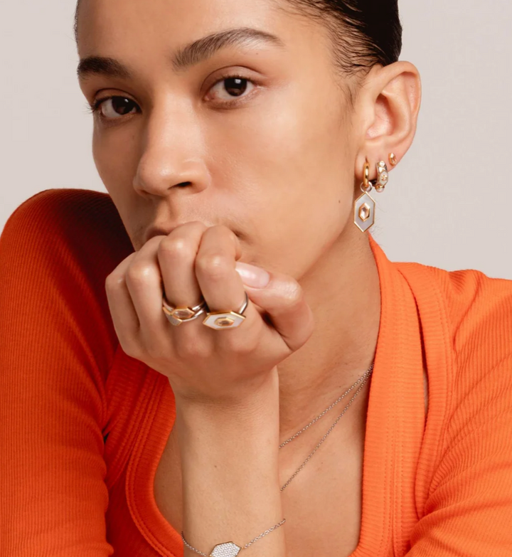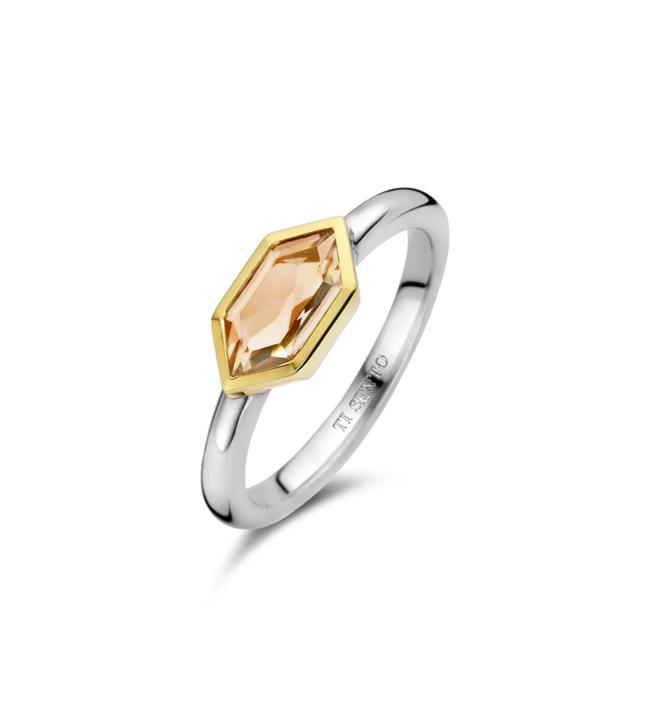 This TI SENTO gold-plated ring flaunts a captivating nude pink stone embraced by a sleek geometric setting, exuding a harmonious balance of contemporary flair and timeless beauty. The perfect blend of modern geometric design and soft, feminine elegance. Whether worn alone as a statement piece or paired with other rings for a trendy stacked look, this nude pink stone ring effortlessly enhances any ensemble with its understated elegance.