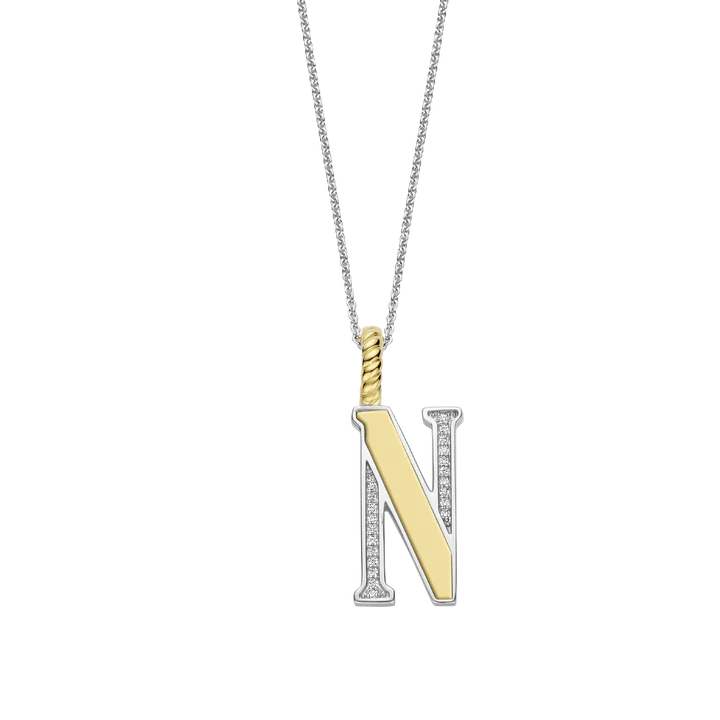 Elevate your style with the TI SENTO gold-plated silver Letter N Pendant. This refined pendant features a yellow gold inlay forming the letter “N”, a captivating contrast to the sparkling white cubic zirconia pavé. Crafted from lustrous 925 sterling silver, it is then coated with precious platinum to protect it and keep it luminous. Its clip ring is plated with radiant yellow gold, exuding a sense of opulent sophistication. The yellow gold inlay shimmers with a timeless warmth, evoking memories of sun-kissed days. The letter N symbolises newness and novelty, embodying a spirit of contemporary style. This pendant is more than just jewellery; it´s a canvas for your self-expression. Wear it solo for a minimalist statement or layer it with other letters or pendants to create a look that’s uniquely you. The pendant comes with a delicate 45cm silver chain.
