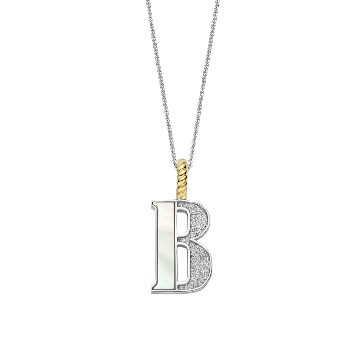Embrace luxury with this TI SENTO gold-plated silver Letter B Pendant. This elegant pendant features a luminous mother of pearl “B” handset with a sparkling pave of white cubic zirconia. Crafted from 925 sterling silver, it is then coated with precious platinum to protect it and keep it luminous. Its clip ring is plated with radiant yellow gold, exuding timeless elegance. The mother of pearl shimmers with an ethereal glow, reminiscent of moonlight dancing on a calm ocean. The letter B represents balance and harmony, embodying both strength and compassion. Wear it solo for a minimalist statement or layer it with other letters or pendants for a trendy, layered look. Personalise your style or celebrate a loved one with this unique initial pendant. The pendant comes with a delicate 45cm silver chain that adds a touch of elegance.