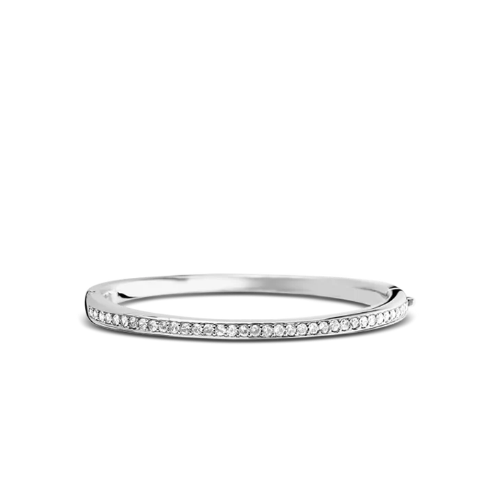This beautiful bracelet is set with cubic zirconia stones, with riveted accents for a touch of texture. This oval-shaped bracelet is coated with a rhodium finish, giving the sterling silver material extra shine and shimmer, as well as reducing wear and tear. Easy to wear and incredibly comfortable, this bracelet features an integrated hinge and lock fastening. This bracelet also features an incredibly smooth interior, reducing the chance of snagging and discomfort when worn.