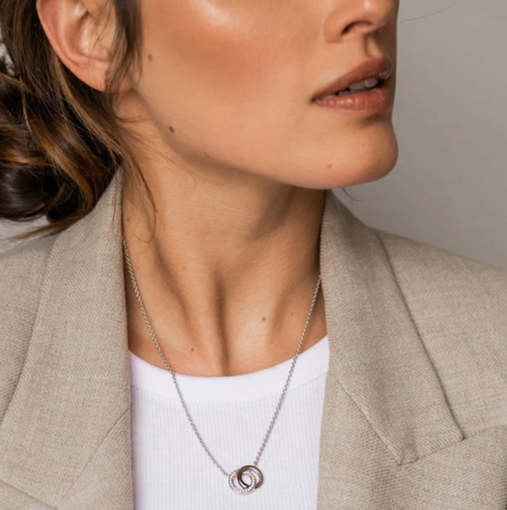 This necklace by TI SENTO has a pendant with 2 entwined circles, often seen as a symbol of a relationship. The close connection felt in a good friendship, relationship or marriage is expressed by the 2 intertwining circles. One of the circles is smooth silver; the other is set with white zirconias. The necklace and pendant are made of rhodium plated sterling silver, which ensures long-lasting shine. The length of the necklace can be adjusted using the extension at the clasp.