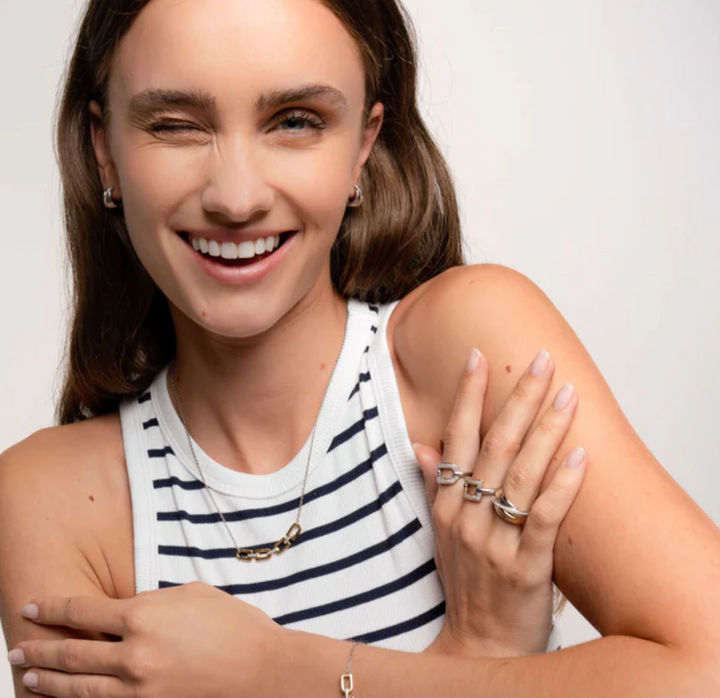 This TI SENTO silver ring showcases our iconic signature link handset with a dazzling cubic zirconia pave. The ring is crafted from 925 sterling silver and plated with platinum in order to protect it from daily wear and keep it luminous. This signature piece blends versatility, boldness and character; it’s not just a ring but a proper expression code. Its meticulously crafted pave exudes luxury and magic. Wear it as a standalone statement piece or stack it with others to create your personalised layered look.
