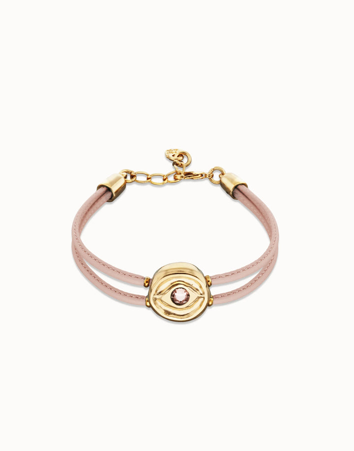 Double pink leather bracelet with gold eye. There are people who are visionary, whose intuition is their compass. Ser intuitiva takes into consideration that mystical side of us, allowing us to bring out our hidden self and show it to the world.