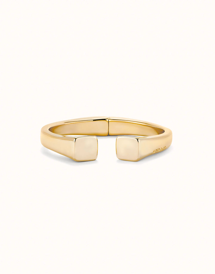 Rigid 18ct yellow gold-plated inner spring bracelet. Smooth finish and square shape at the ends. Made in Spain with a 100% handmade process. Jewellery for outspoken people who want to draw attention through the geometric shapes of these pieces. A collection with a clear cubist inspiration brought to the present day. Shapes that decompose and recompose, offering endless possibilities of mix & match between silver or gold-plated and faceted black and white crystals. Discover the collection ser sin complejos.